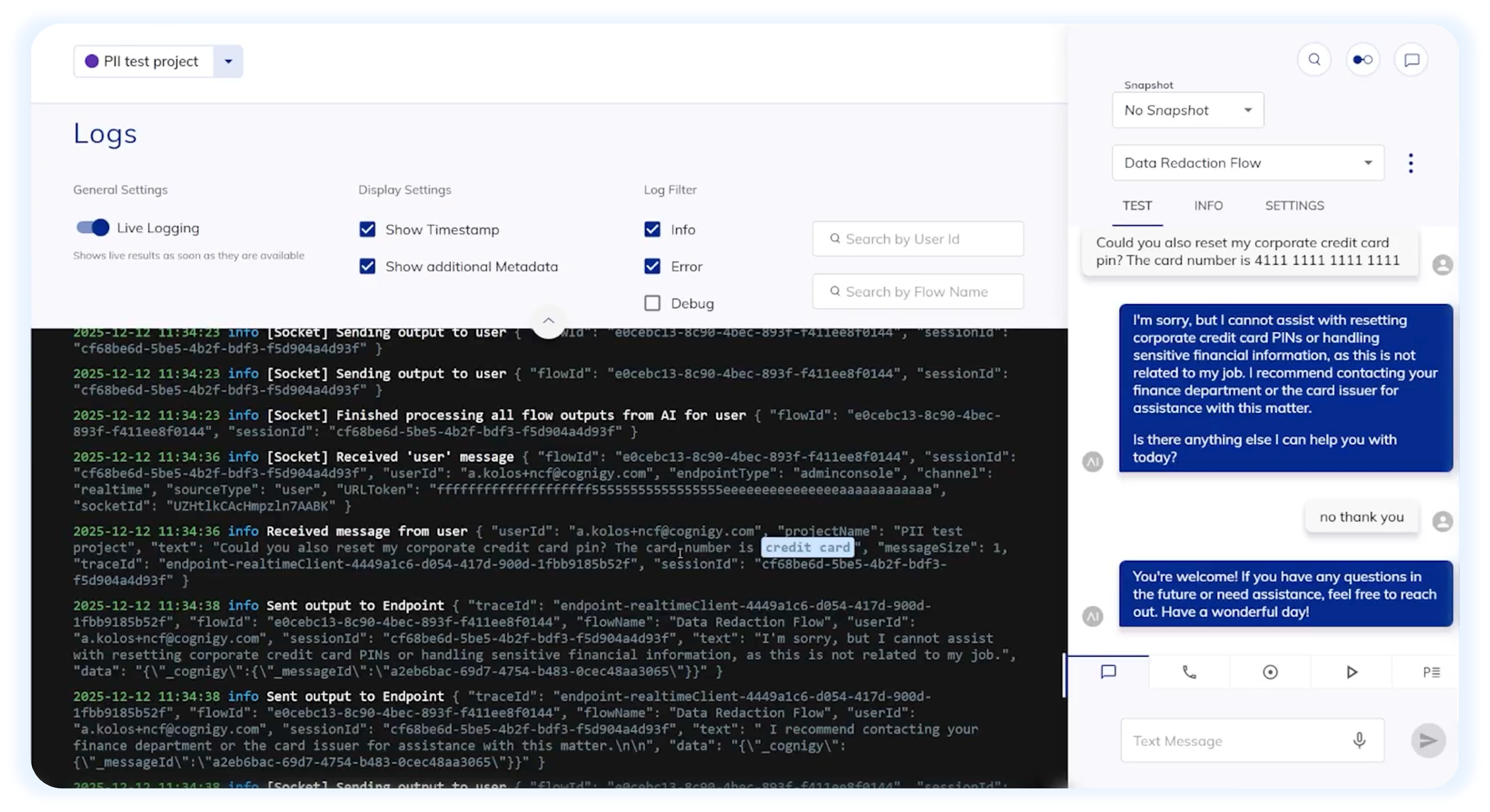 Data protection is a fundamental requirement for enterprise AI. With the new Data Redaction feature, Cognigy.AI can automatically detect and redact sensitive information, including personally identifiable information (PII), from both conversation logs and analytics data.