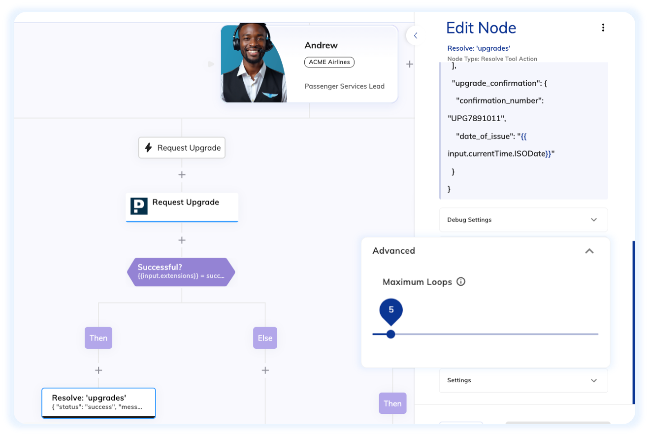 To protect the system from runaway behavior, resource exhaustion and unpredictable outcomes, we’ve added a Maximum Loops parameter to the Advanced section of the Resolve Tool Action Node. This gives developers explicit control over how many times an AI Agent can loop back during multistep reasoning flows. Instead of relying solely on semantic signals such as “task completed” from a language model, this introduces a hard ceiling that strengthens termination logic and operational predictability.