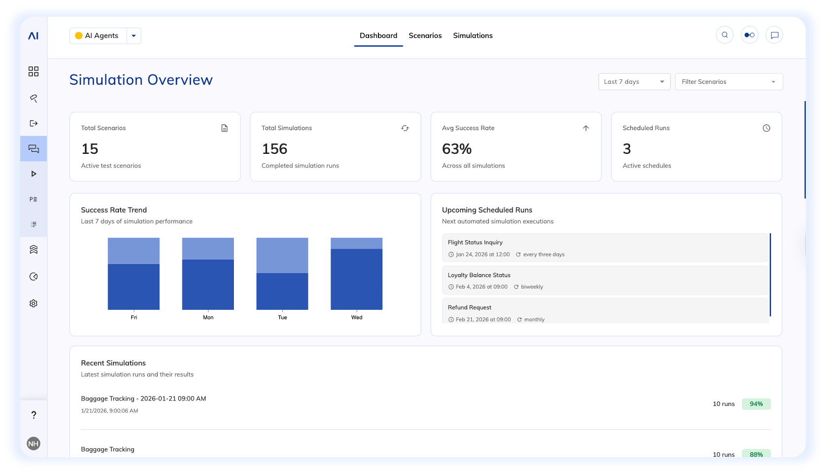 At the highest level, the overview dashboard provides a consolidated view across past simulations. Teams can quickly assess overall quality and manage scheduled simulations at a glance. Success rate trend shows changes over time, making it easy to detect regressions early and validate improvements after updates. Recent simulation results highlight which workflows need attention immediately, enabling quick prioritization.