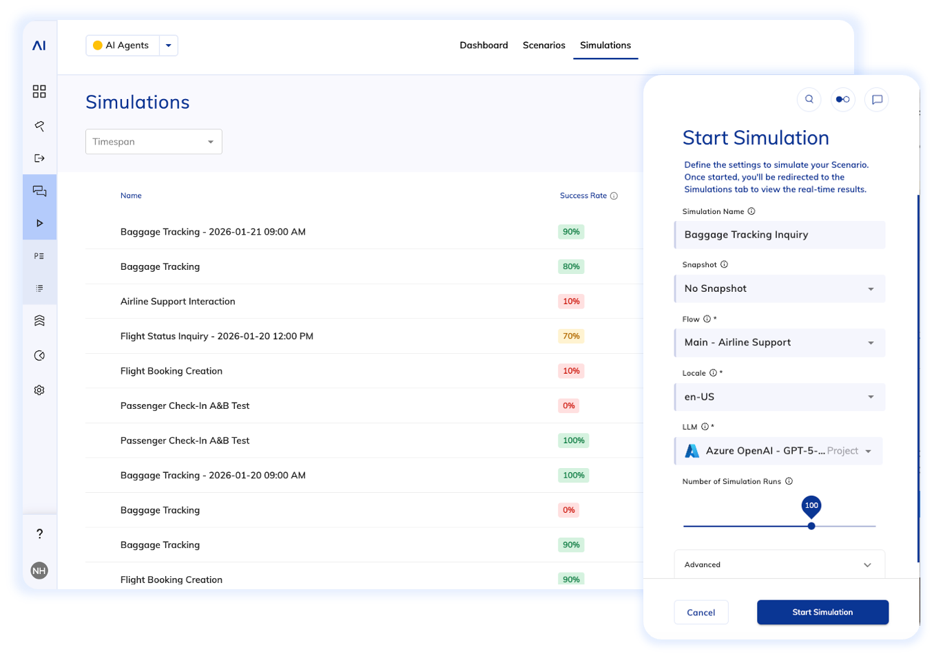 This makes it possible to validate not just whether an Agent can succeed, but how reliably it succeeds across diverse interactions. Teams can compare versions side by side, validate multilingual consistency, or predict the impact of prompt, logic, or model changes before they reach production.