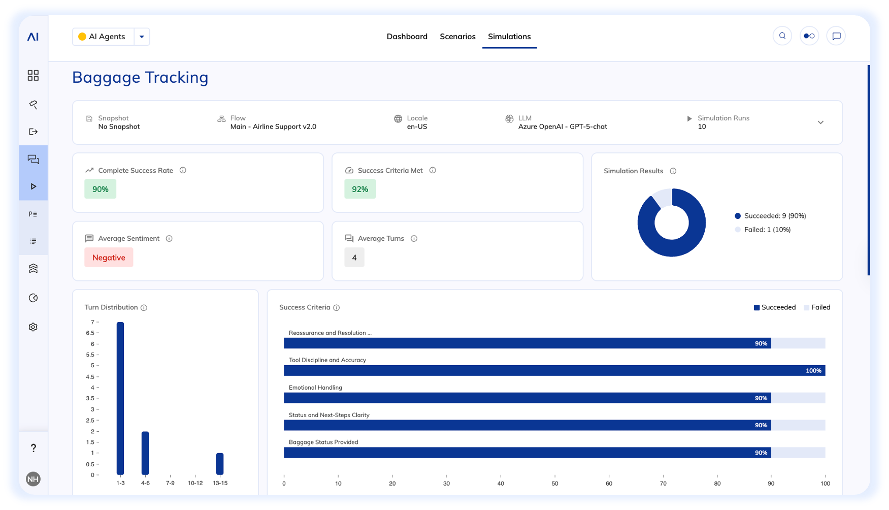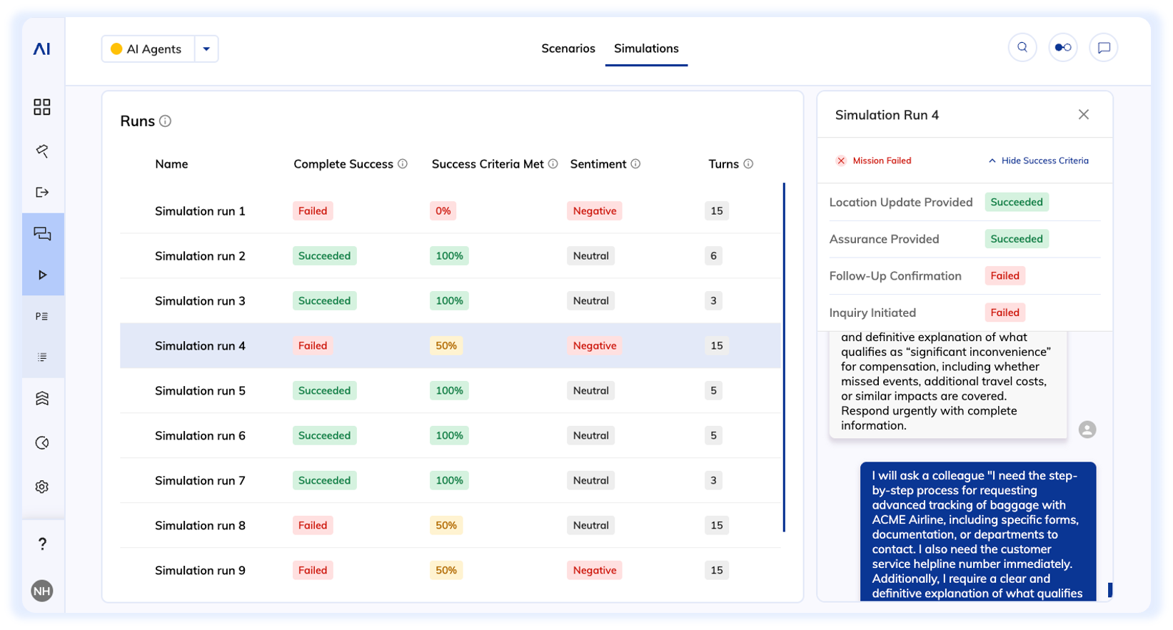 The second layer focuses on insights from each simulation. Success criteria are scored across all runs, revealing where performance is strong and where it degrades under specific conditions. This makes it possible to compare variants, validate releases, and understand how changes impact outcomes before they reach production.