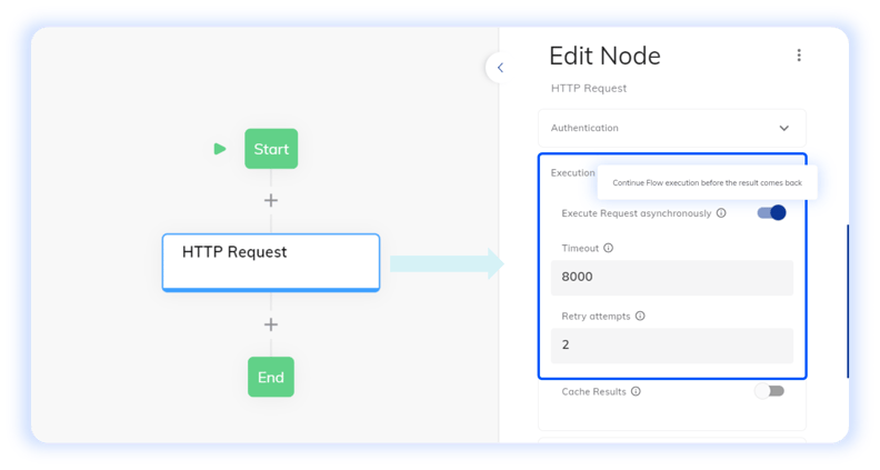 When the Asynchronous Request Execution option is activated, the HTTP Node will execute the request without awaiting a response, avoiding delays in Flow execution. Two options are available for configuration: