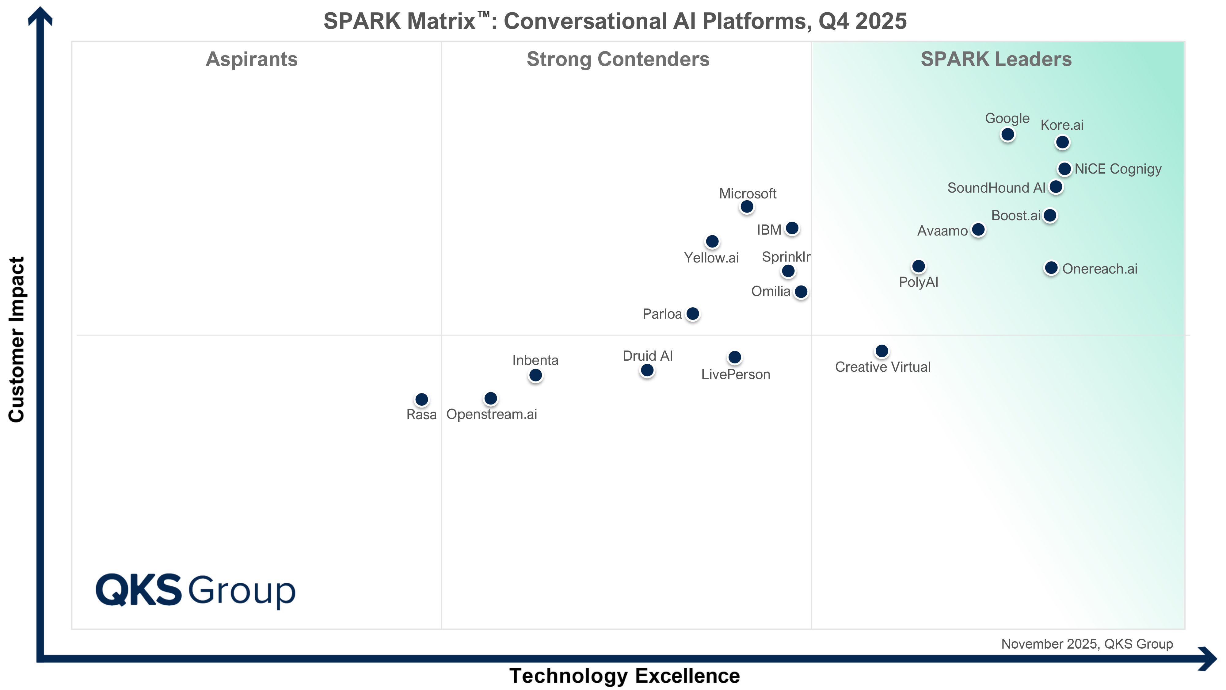The QKS Group SPARK Matrix™ includes a detailed analysis of the global market dynamics, major trends, vendor landscape, and competitive positioning. The study also provides a competitive analysis and ranking of the Conversational AI Platforms (CAIPs) providers in the form of the SPARK Matrix™.
